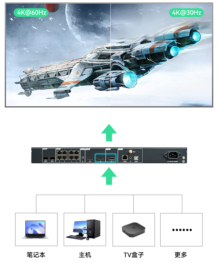 支持HDMI2.0、DP1.4二选一,最大支持 4096×2160@60Hz 输入