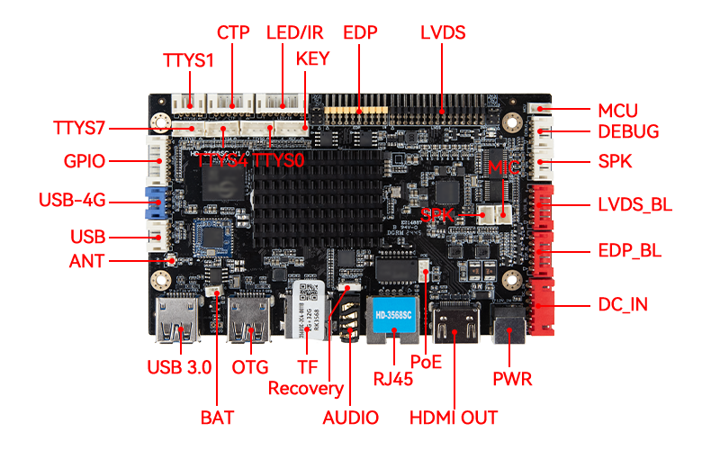 | 扩展接口 | USB 3.0 HOST、USB 3.0 OTG、 2×USB 2.0、4×UART、GPIO、 RTC、IR、PoE、PCIe |