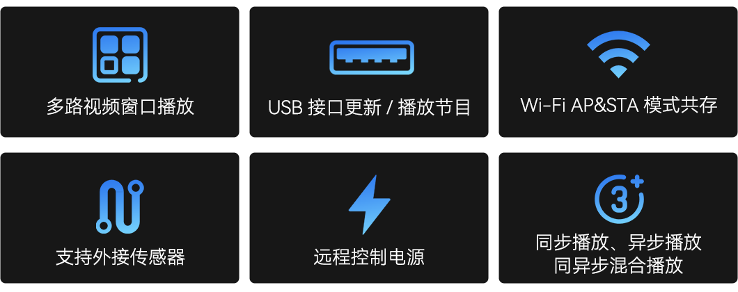 | 节目支持 | 视频、图片、文本、动画字、时钟、流媒体、计时、天气、表格等 | |